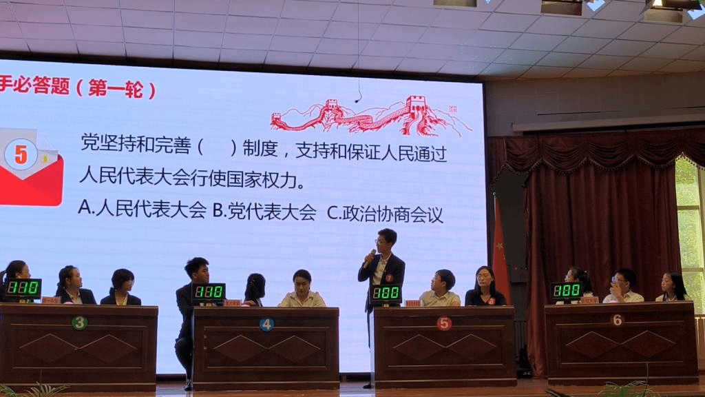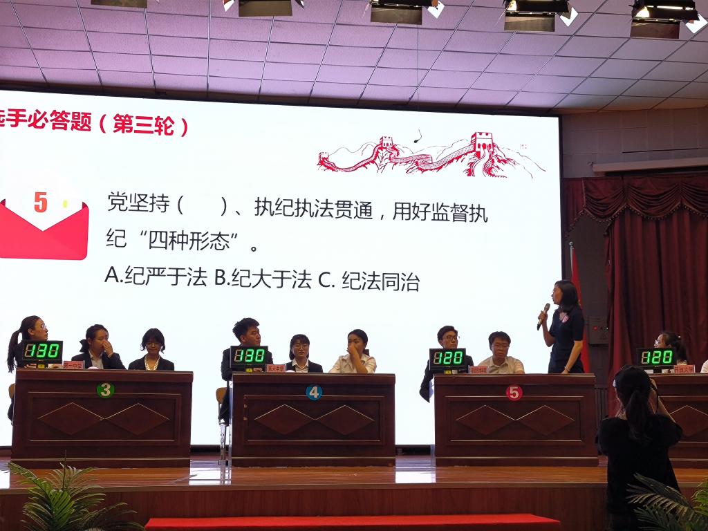 5月13日16时,在北师大附属中心开展决赛如期而至。在自克拉玛依市教育系统的7支代表队参加了此次知识竞赛。竞赛共分为三个环节,分别为必答题、抢答题和风险题。比赛中,参赛选手积极踊跃、密切配合,展示了良好的精神风貌,观众积极互动,不时响起阵阵掌声。学院的三位选手发挥个人优势和集体智慧,全力以赴抢答每一道题,最终经过激烈的比拼,我院选手获得了第二名的优异成绩。