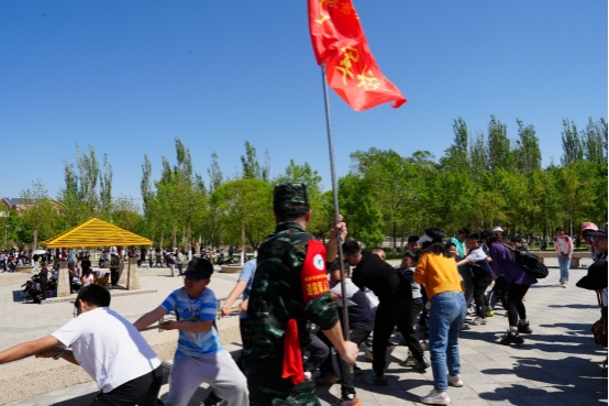 活动以“红色征程·石油魂”为主题,全程模拟红军长征场景,途经克拉玛依河、克拉玛依油田英雄纪念碑等地标。学生们身着校服,背负简易行军包,在“少年军校”编制下有序行进。途中设置授旗仪式、石油工人故事宣讲、红色诗词诵读等环节,让学生在徒步中感悟革命先辈与石油工人的奉献精神。活动现场,学生们高呼“掉皮掉肉不掉队,流血流汗不流泪”的口号,展现出昂扬斗志。学院退役军人志愿者全程担任教官与安全员,引导学生保持队形、规范动作,并通过拉歌比赛、拔河竞赛等形式提振士气。