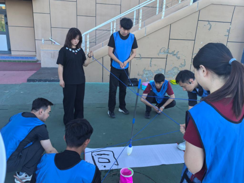 而“蒙眼吃香蕉”项目更是趣味十足,师生两两一组,在蒙眼的状态下相互配合完成任务。期间,各种意外状况引发阵阵欢笑,轻松愉快的氛围。在这种充满趣味和挑战的情境中,师生们放下了平日的拘谨,以更加开放和乐观的心态面对未知,提升了心理调适能力。