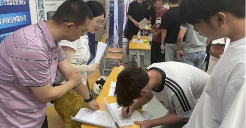 双选会现场气氛热烈,毕业生手持精心准备的简历穿梭于展位间,积极和企业交流,了解岗位要求、薪资待遇等,结合自身专业和职业规划投递简历,展现出十足的求职热情。