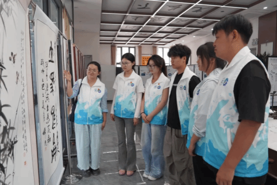 古色古香的建筑风格里,墨香与书香交织成厚重的文化气场。在 “琴棋书画”主题展区,实践团指导教师张玲驻足展陈前,为实践团成员娓娓道来古琴的悠远、围棋的哲思、书法的风骨、绘画的意境,将历史故事与中华优秀传统文化熔于一炉。“原来每一笔勾勒都藏着民族的智慧,每一处留白都写着文明的传承。”实践团成员深有感触,更坚定了“以语为媒、以文为桥”的信念——推广国家通用语言文字,不仅是沟通的需要,更是让中华优秀传统文化在祖国大地生生不息的使命。