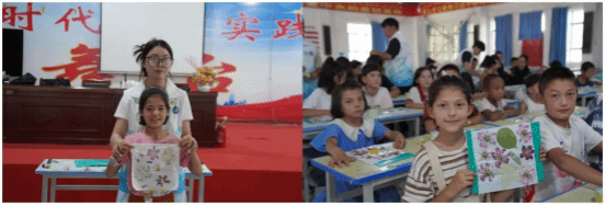 回到课堂,孩子们紧紧跟随实践团成员的指导将花叶固定在素布上,用锤子轻轻敲打。当胶带撕下的瞬间,叶脉的纹路、花瓣的轮廓跃于绢布,夏日的生机被永远定格。“看!我的手帕上有好多小花!” 一个孩子举着作品欢呼,其他人纷纷展示自己的“自然画作”。在拓染的巧思里,孩子们读懂了自然的诗意;在分享的话语中,国家通用语言成为传递喜悦与发现的桥梁。
