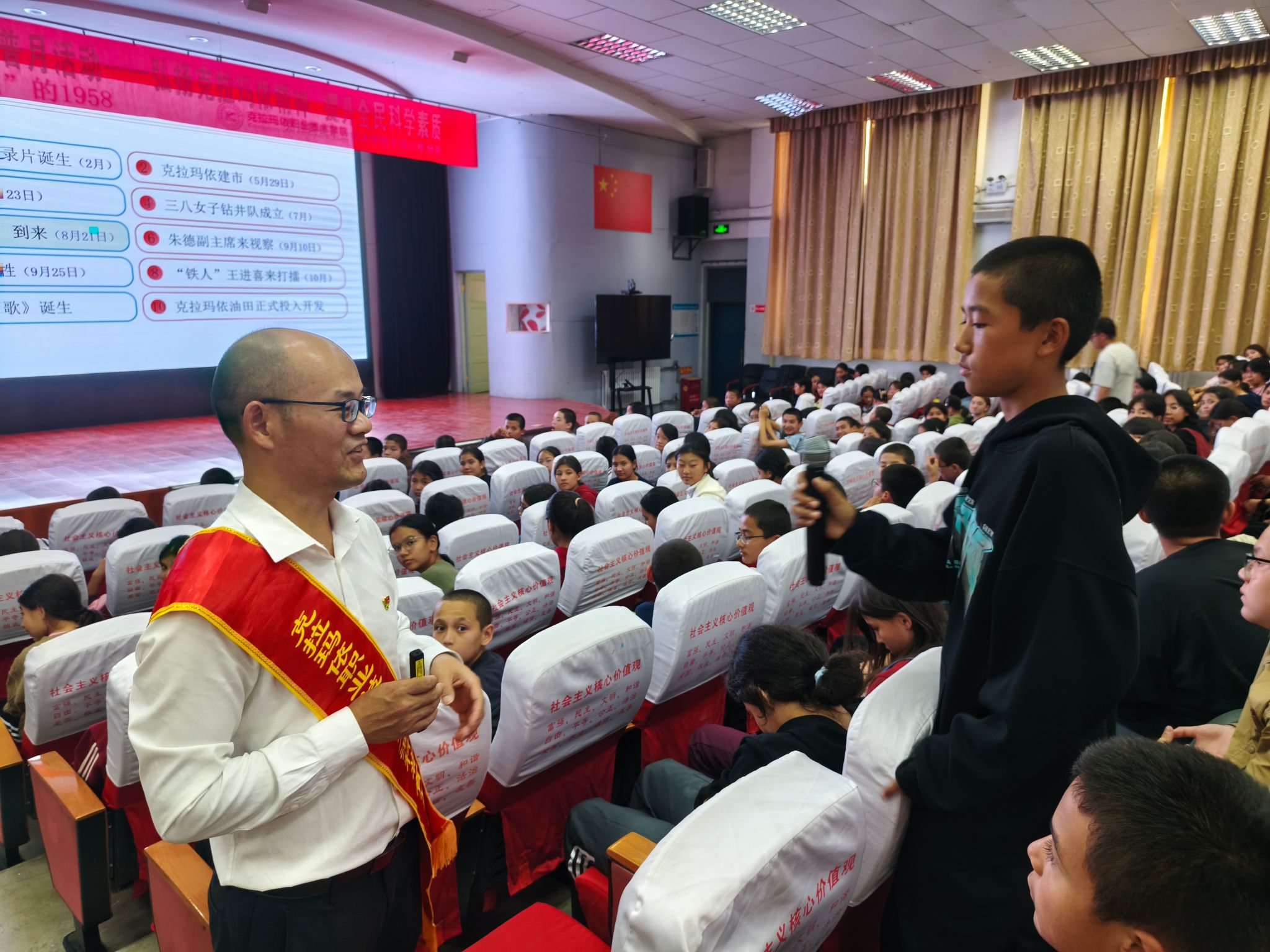 同学们认真聆听克拉玛依第一代的感人事迹