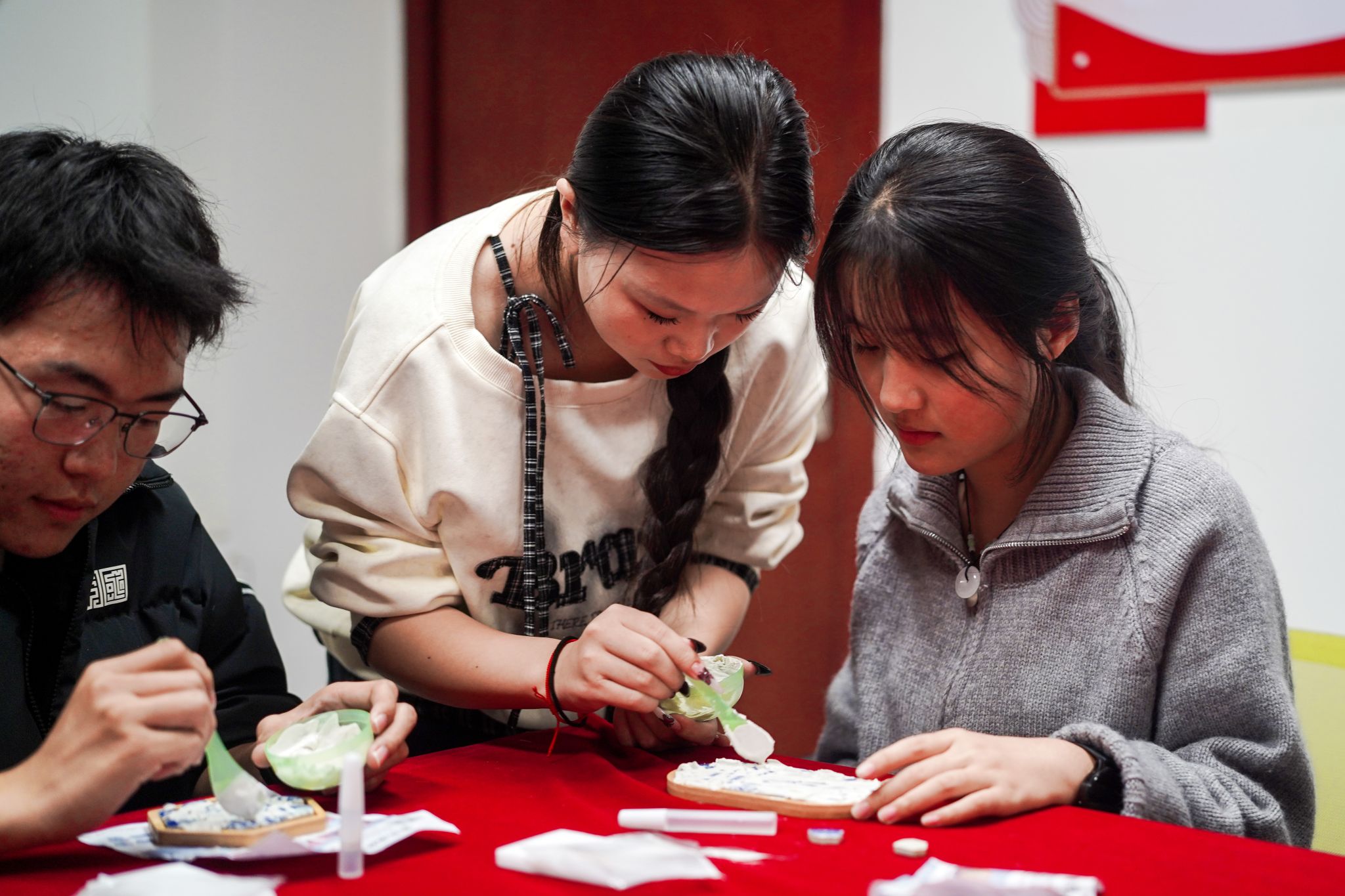 活动伊始,主持人讲解了寒露节气与青花瓷的起源及相关经典诗词。在景德镇青花瓷杯垫制作环节,同学们专注设计绘制,确定青花瓷纹理搭配方案,以青花瓷拼接为心灵寄托,舒缓学习生活压力。杯垫完成后进入展示环节,同学们手持作品供众人观赏,深化对活动主题文化价值的理解。