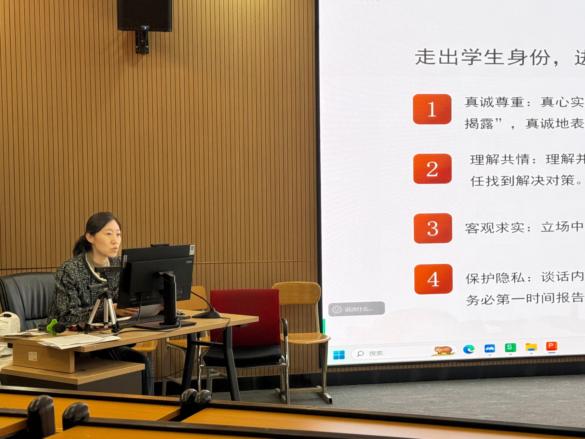 随后,马芮老师聚焦班主任工作的另一核心技能,带来了《谈心谈话的艺术与事务处理》的精彩分享。她深入剖析了与学生进行有效沟通的四个原则,阐述了谈心谈话应遵循的步骤技巧及注意事项。马老师通过生动的典型案例演示了如何针对不同性格、不同境遇的学生开展个性化、有温度地交流,如何倾听学生心声、疏导学生情绪、引导学生成长,并妥善处理相关事务。她指出,富有艺术性的谈心谈话是建立良好师生关系、实现精准育人、防范化解风险的重要桥梁。