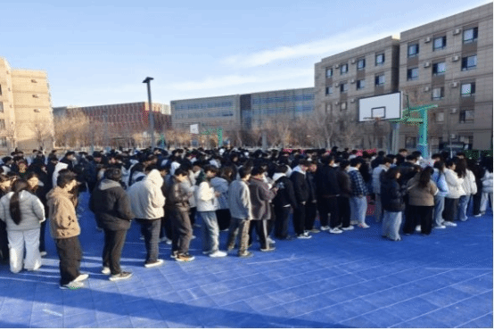警报拉响后,学生迅速在走廊、楼梯两侧弯腰低姿、捂口鼻前行,按“就近、安全、有序”原则撤离至篮球场安全地带;各班立即清点人数并逐级上报,现场指挥同步研判、处置突发情况,确保全员安全、秩序稳定。