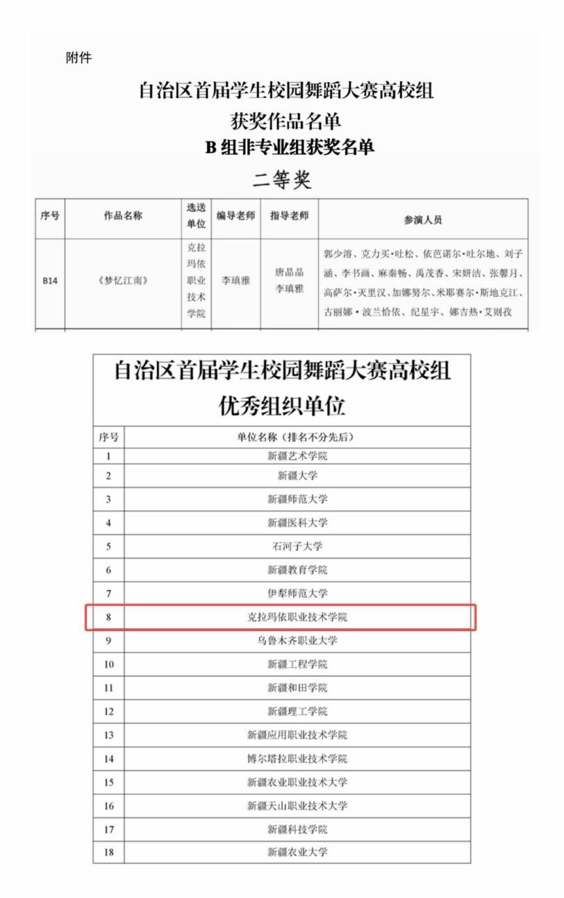 12月29日,由新疆维吾尔自治区教育厅、自治区文学艺术界联合会、新疆舞蹈家协会联合主办,新疆大学承办的自治区首届学生校园舞蹈大赛(高校组)圆满落幕。克拉玛依职业技术学院选送的舞蹈作品《梦忆江南》在全区18所高校的39个决赛作品中脱颖而出,荣获非专业组二等奖。