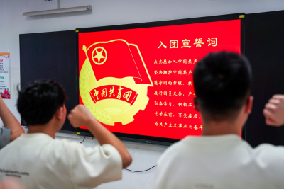 最后,全体团员面对团旗,高举右拳,重温入团誓词。“我志愿加入中国共产主义青年团……”铿锵誓言在教室回荡,团员们眼神坚定,仿佛又回到入团那一刻的热血沸腾。团支部书记在总结中号召大家以此次教育评议为新起点,检视自我、砥砺前行,用实际行动践行“请党放心,强国有我”的铮铮誓言。