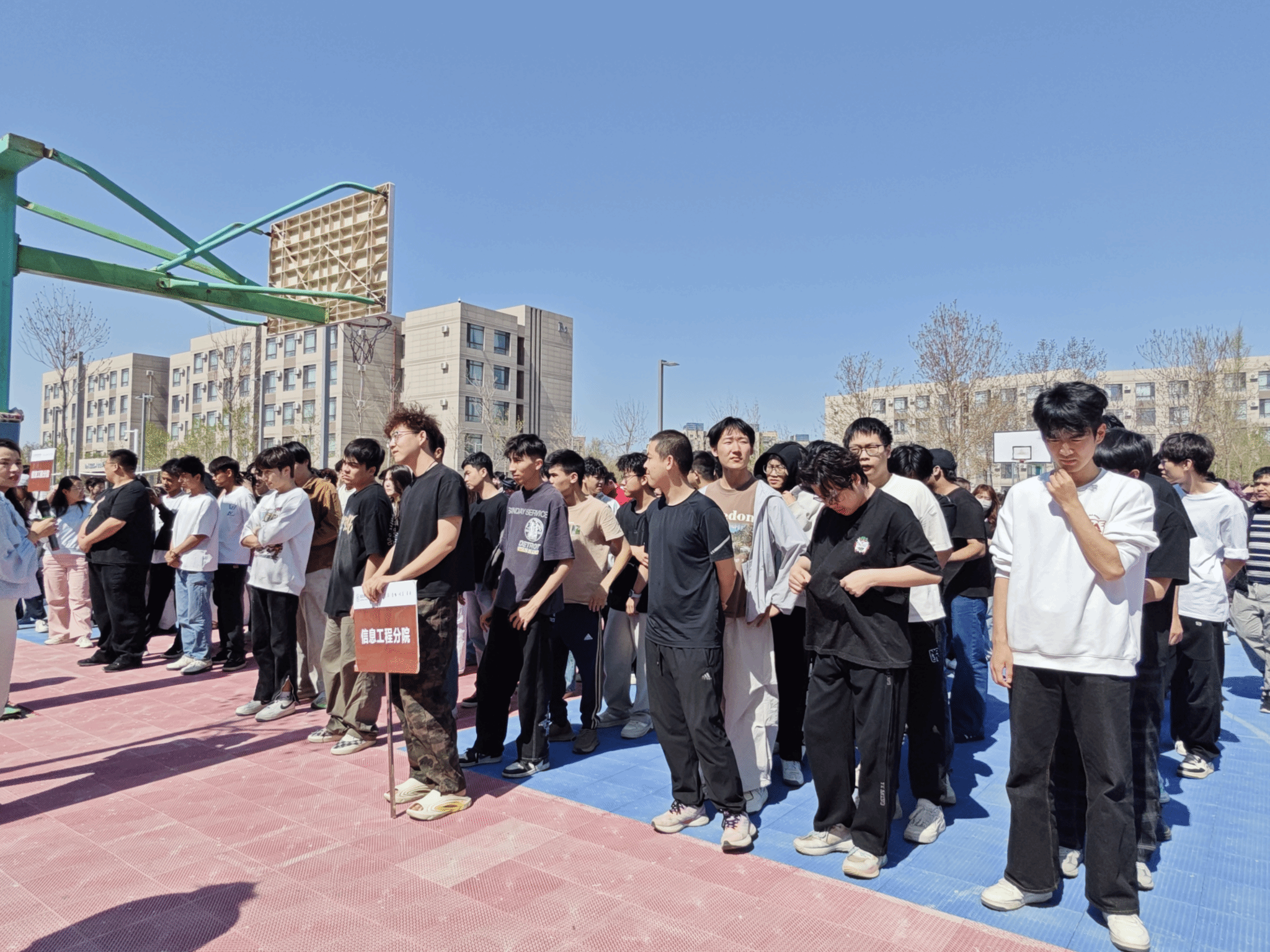 当日14时整,随着模拟火情警报在宿舍区骤然拉响,演练正式拉开序幕。听到警报后,两栋宿舍楼内的学生在各楼层引导员和宿管人员的指挥下迅速进入应急状态。大家严格按照消防疏散要求,捂住口鼻,降低身体重心,沿着宿舍楼内既定的紧急疏散路线,快速、有序地向室外安全区域撤离。整个疏散过程紧张而不慌乱,紧凑而有序,同学们神情专注,行动迅速,充分展现了良好的纪律性和应急反应素养。所有学生撤离至安全集合点——户外篮球场,达到了快速疏散的预期目标。