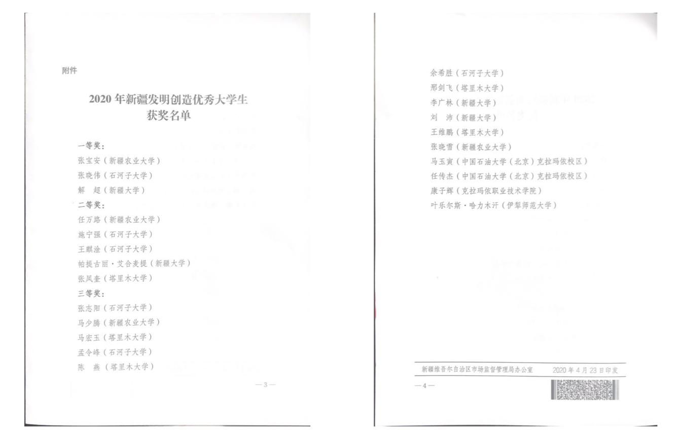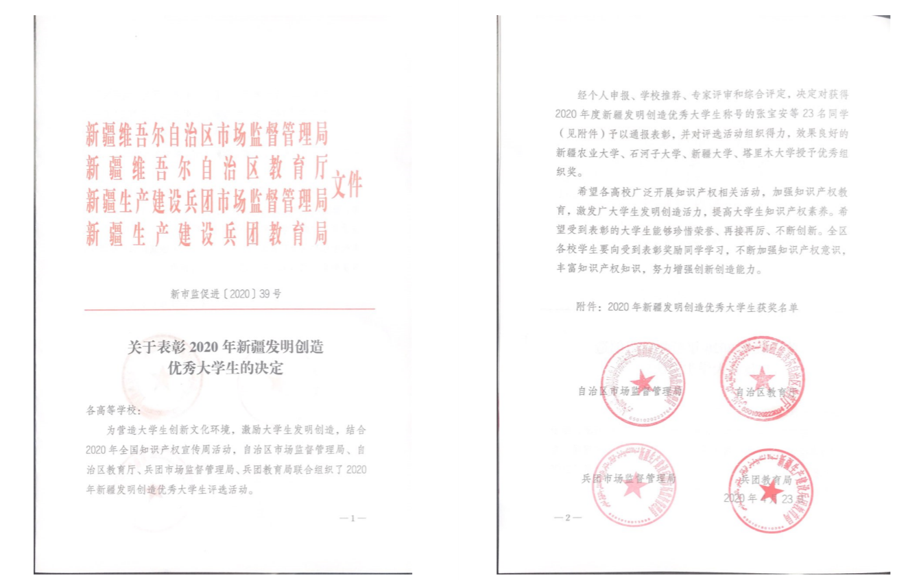 为营造大学生创新文化环境,激励大学生发明创造,结合2020年全国知识产权宣传周活动,自治区市场监督管理局、自治区教育厅、兵团市场监督管理局、兵团教育局联合组织了2020年新疆发明创造优秀大学生评选活动。经个人申报、学校推荐、专家评审和综合评定,评选出23名大学生赋予2020年度新疆发明创造优秀大学生称号,石河子大学、新疆大学、中国石油大学(北京)克拉玛依校区、克拉玛依职业技术学院、新疆农业大学、塔里木大学学子获得殊荣。我院机械工程系机制1731班康子辉同学获2020年新疆发明创造优秀大学生称号,成为唯一一名高职院校的发明创造优秀大学生。