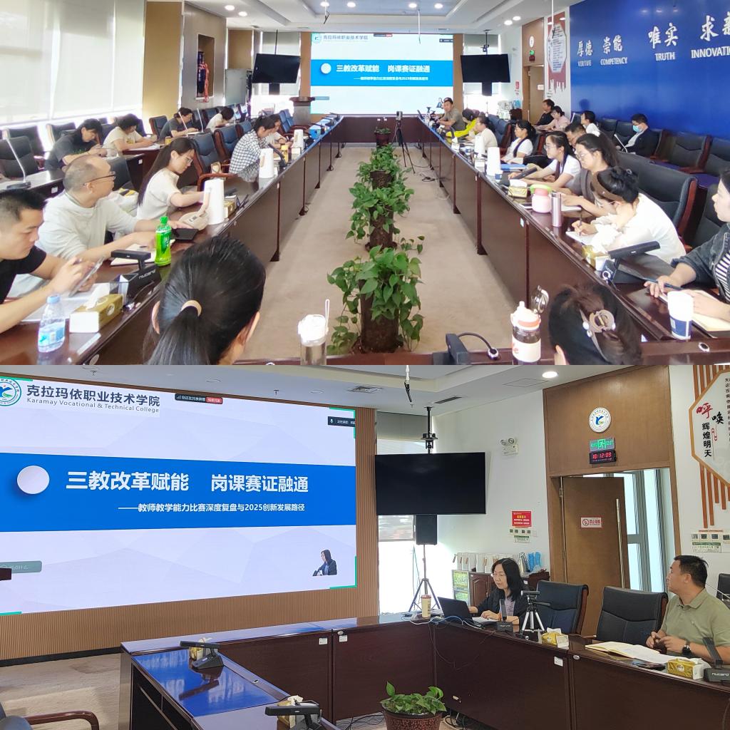为全面提升教师教学能力,推动“三教改革”"与“岗课赛证”深度融合,助力学院教师在2025年自治区教师教学能力比赛中再创佳绩。5月28日,学院教务处再次组织召开了教师教学能力比赛专题培训会。会上,刘旭莹副院长以《三教改革赋能---岗课赛证融通》为主题对6支参赛团队20余名教师进行了深度培训,教务处处长蒋定建对近期备赛工作进行了具体部署。 会议现场 培训会上,刘旭莹副院长首先对2024年自治区教师教学能力比赛进行全面...