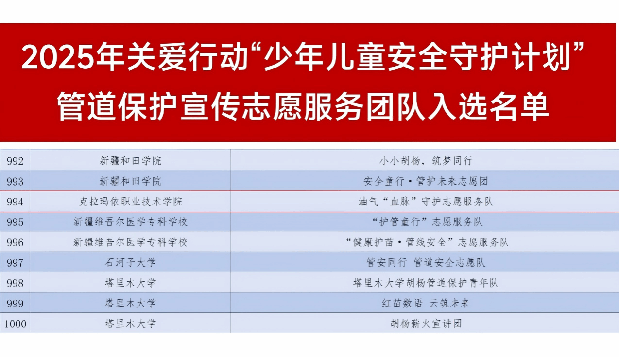 在11月12日团中央青年志愿者行动指导中心、中国少年儿童新闻出版总社有限公司联合国家石油天然气管网集团有限公司共同发布的《2025年关爱行动“少年儿童安全守护计划”管道保护宣传志愿服务团队入选名单》中,我院石油工程分院油气“血脉”守护志愿服务队成功入选。 本次活动共有596所高校的1000支志愿服务团队入选,包括天津大学、中南大学、新疆大学等疆内外高校。我院入选团队由油气智能开采技术、油气储运技术、数字媒体技术等专业的十名大学生组成。...
