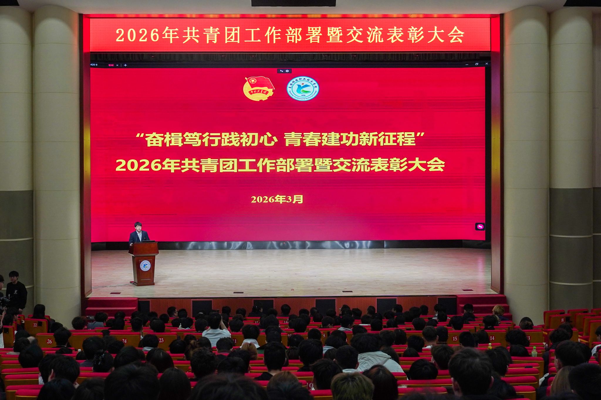 为总结2025年工作成效,部署2026年重点任务,表彰先进典型、凝聚青年力量,3月18日,学院2026年共青团工作部署暨交流表彰大会在克拉玛依校区大学生活动中心礼堂隆重举行。学院党委书记张应勋,党委委员、副院长张国伟,教育局党组成员、督导室主任于洋,团市委青宣部部长杨帆出席会议。表彰大会现场国旗护卫队庄严出旗会上,学院团委书记王林槐作工作报告,全面总结2025年团委工作成效,剖析当前工作存在问题,明确2026年以铸牢中华民族共同体意识为主线,...